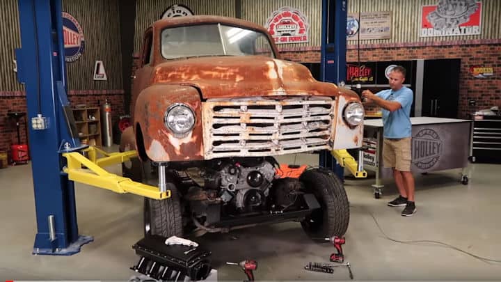 Instead of choosing just any ol’ car, he uses the bone-stock LS1 truck engine out of one of his own vehicles – “Stuie” his prized ’51 Studebaker pickup.