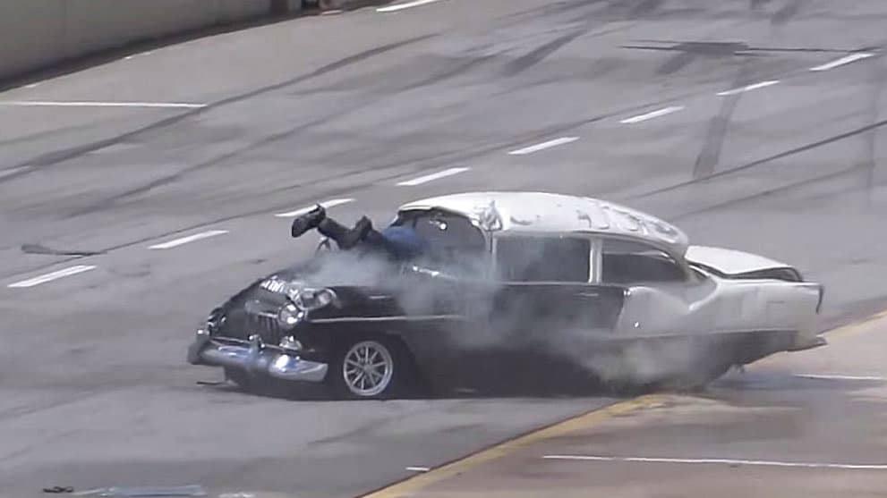 After a near-save, the ’55 Chevy tumbles down the strip several times before coming to a stop — but not before the driver is nearly ejected from the cockpit, with his legs flying out of the windshield. Watch…