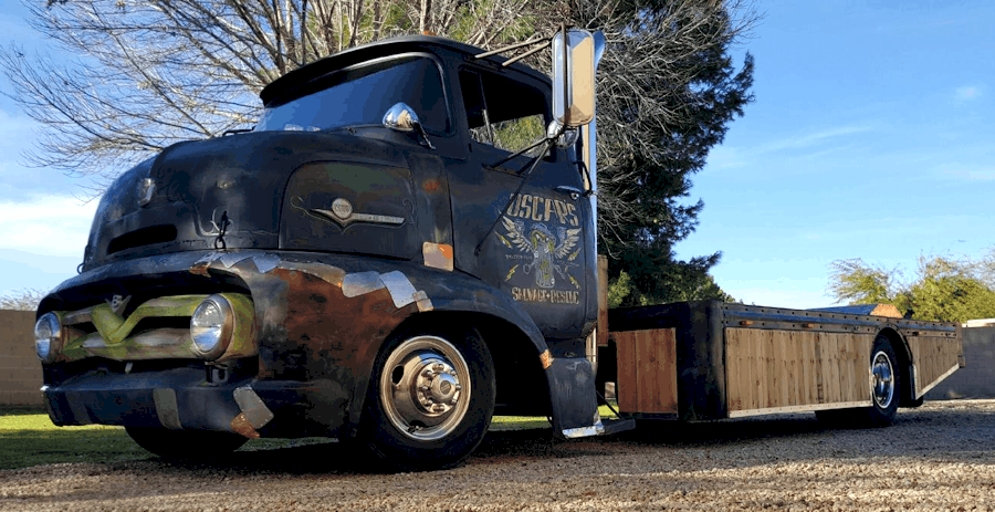 The chassis donor for this project, a 1990 Ford E-350 was used to retrieve it’s own new skins. Then, with the new skins in place, the ’56 COE delivers the discards to the recycler.
