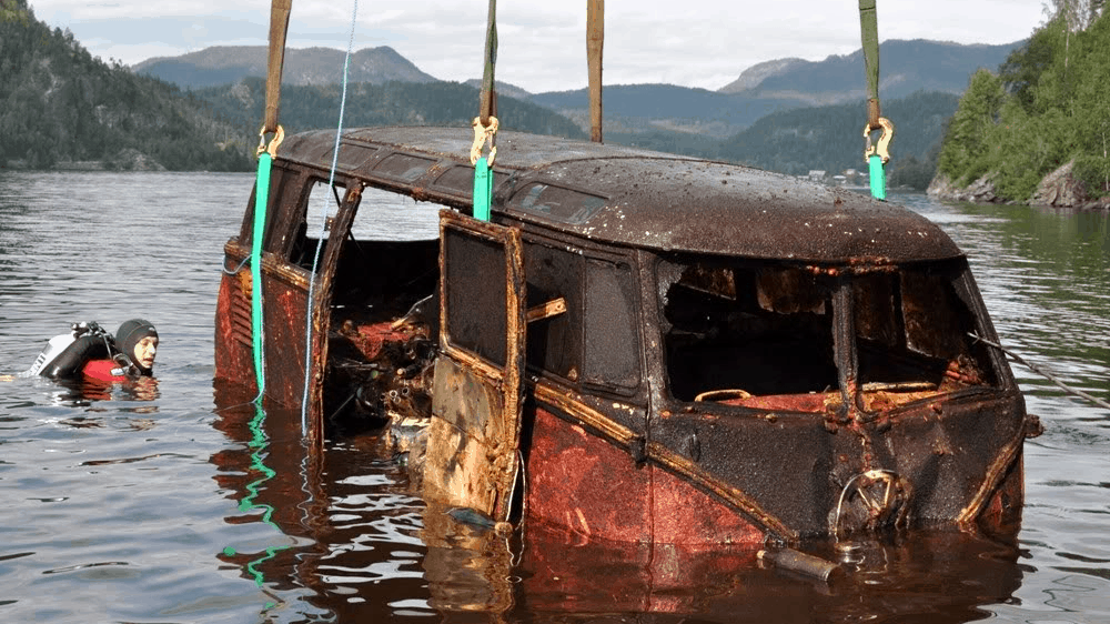 This 1957 Deluxe Volkswagen bus was found underwater in a Norwegian Fjord in 2003 following a tip from the guys who actually put it there in 1973.