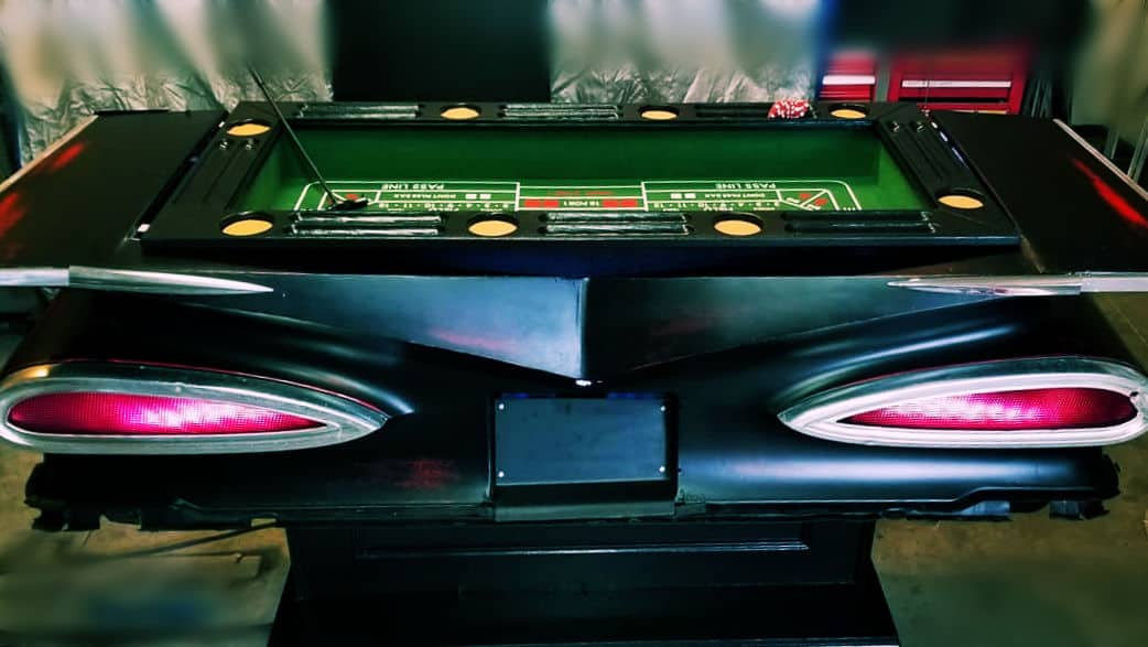 A 1959 Chevy Impala trunk section was wrapped around a 3-in-1 casino table and bar featuring working cat-eye taillight lenses so distinctive of this classic model.