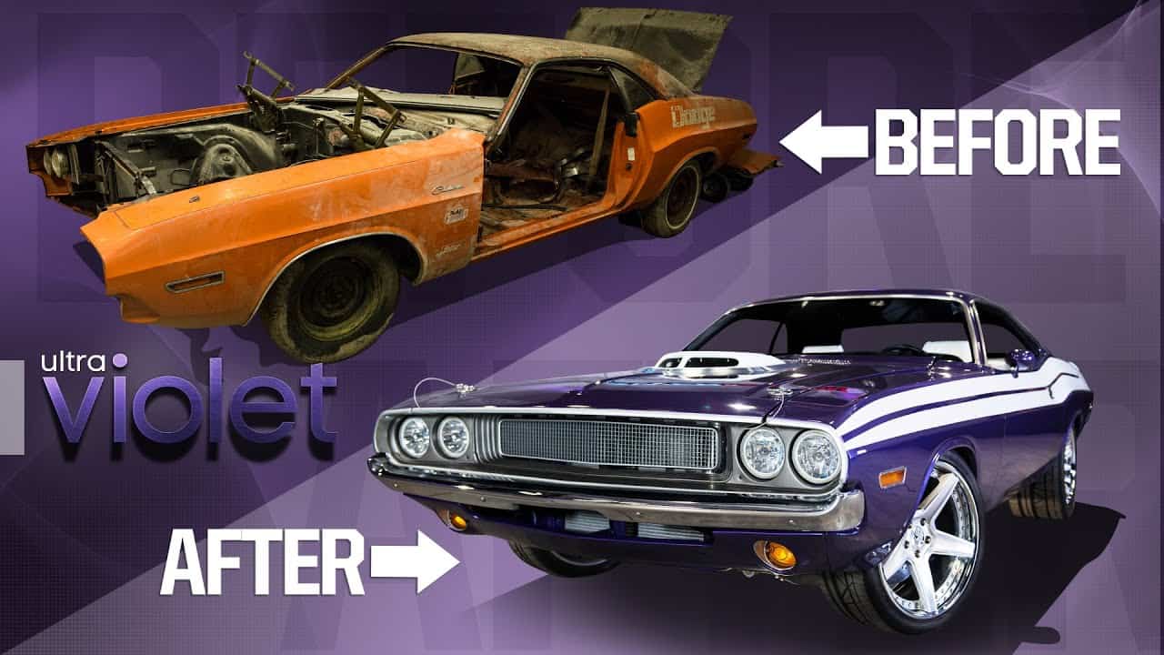 Next, celebrity builder Chris Ryan shows how-to lay down metallic paint and graphics on the very purple Challenger and the team fabs a high flow EFI fuel system, serpentine belt drive, and dual-fan cooling system for ’70 Hemi Challenger.
