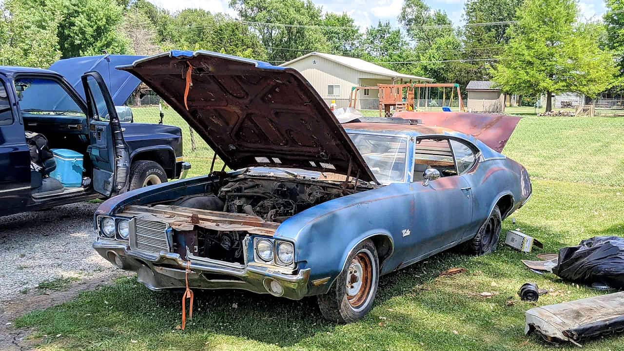 Other than being a mouse motel in a former life and lacking any sort of transmission, driveshaft, or signs of compression, the Olds is a pretty solid start for a muscle car project.