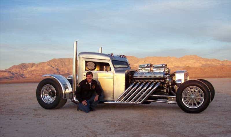 Grubb took a 1960 Peterbilt 351 and went to work. He cut 5 inches out of the back, 8 out of the front to give it a slight rake look. The front windshield was formed to follow the lines of the cowl. So, from the front, it looks like it’s angry.