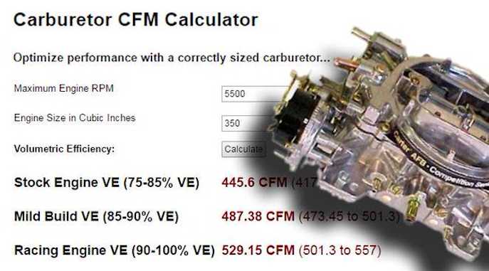 This carburetor calculator is designed to give the engine’s air intake volume requirements in Cubic Feet per Minute.
