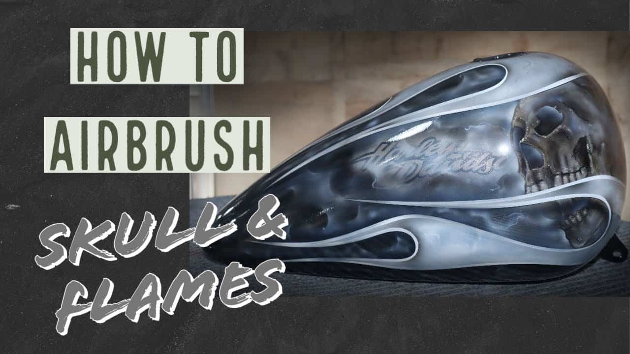In this video, Time Warp Custom Paint breaks down the process of how to airbrush a realistic-looking skull and layout classic style flames in a granite texture on a Harley Davidson gas tank.