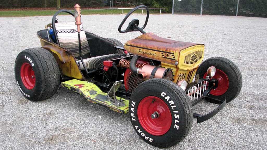 In fact, the potential illegality of a full-size rat rod is what drove one Ontario man to build this radical rat-rodded 1960s Viking mini-mower instead.