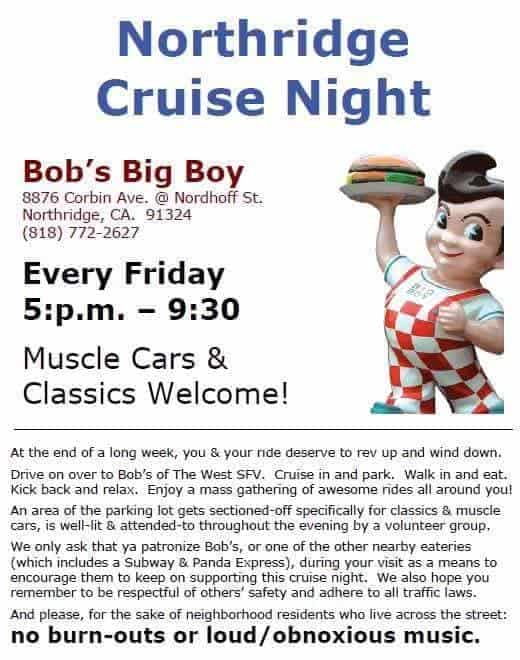 Drive on over to Bobs of the West San Fernando Valley. Cruise in and park. Walk in and eat. Kick back and relax. Enjoy a mass gathering of awesome rides all round you!