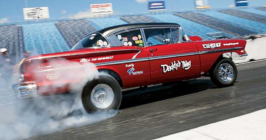Another car that always turned heads and was the ire of other gassers was Naperville, Illinois-native Frank Marshall’s Metal-Flake Red ’58 Chevy named “Daddy’s Thing.”