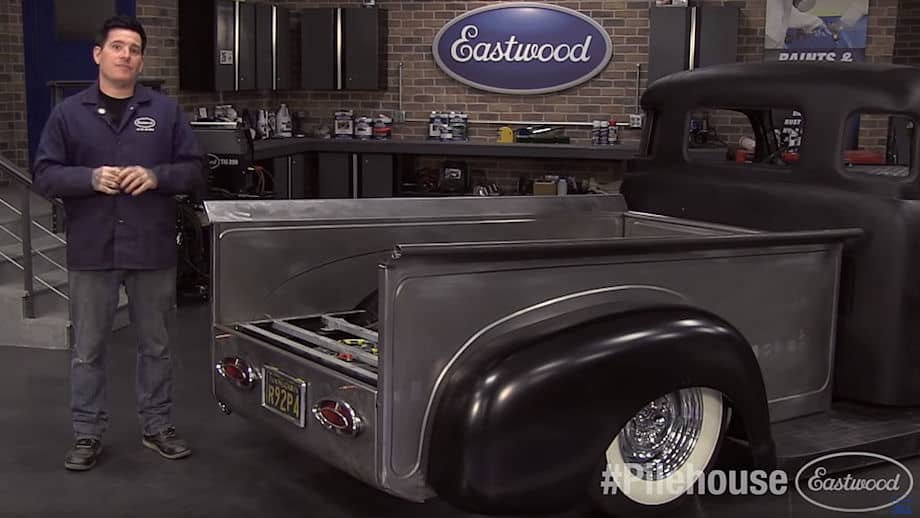 Matt, with the help of Mark from our Research and Development Department, cuts the sheet metal to the proper shape, rolls beads in the bed sides for strength and appearance, adds a top rail tube, builds a rear roll pan and attaches new fenders – all using Eastwood Products like MIG and TIG welders, bead roller with the new bead roller guide, snips, shears, shrinkers and stretchers and more.