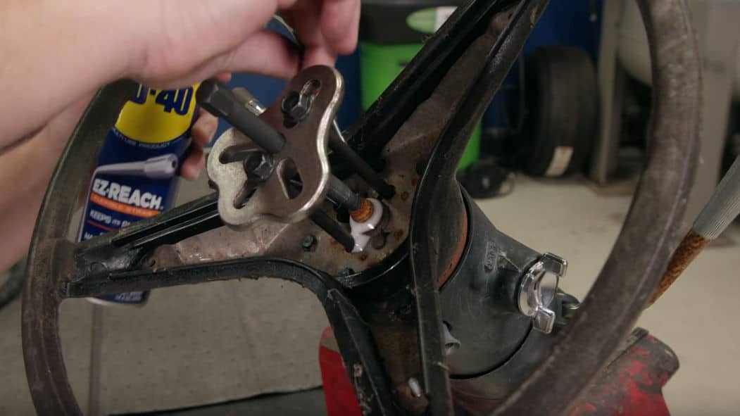 To get started, remove the horn button and the nut that holds the steering wheel out of the way. Then you’ll want to get a puller installed to pull the wheel. Once you get your puller set up and the wheel removed be careful not to yank the wire out that attaches the horn.