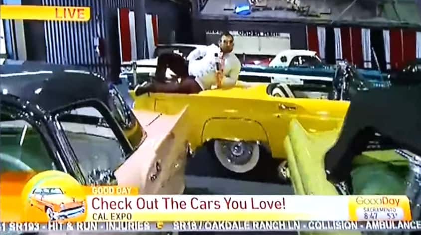 A local CBS reporter in California was apparently fired after he — during a live news segment — climbed atop classic, privately-owned cars, even seemingly damaging one of them in the process.