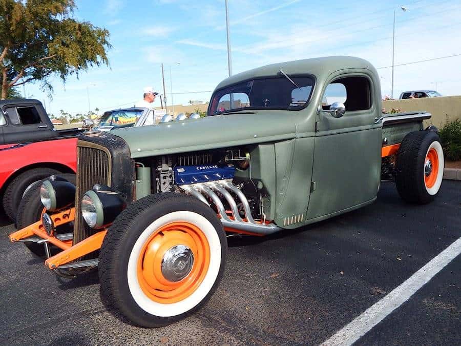 Patrick dropped and chopped the truck, punched literally hundreds of louvers, built the dash, and fitted the truck with an engine and transmission from a 2008 GMC truck — the Cadillac valve covers keep folks guessing.