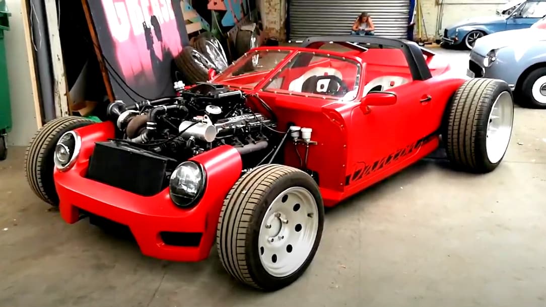 This is an early 1990s 911, the 964. It has a chop top roof, wide rear-end, and exposed Ford Big Block engine with a shaker scoop and custom individual straight-pipes…
