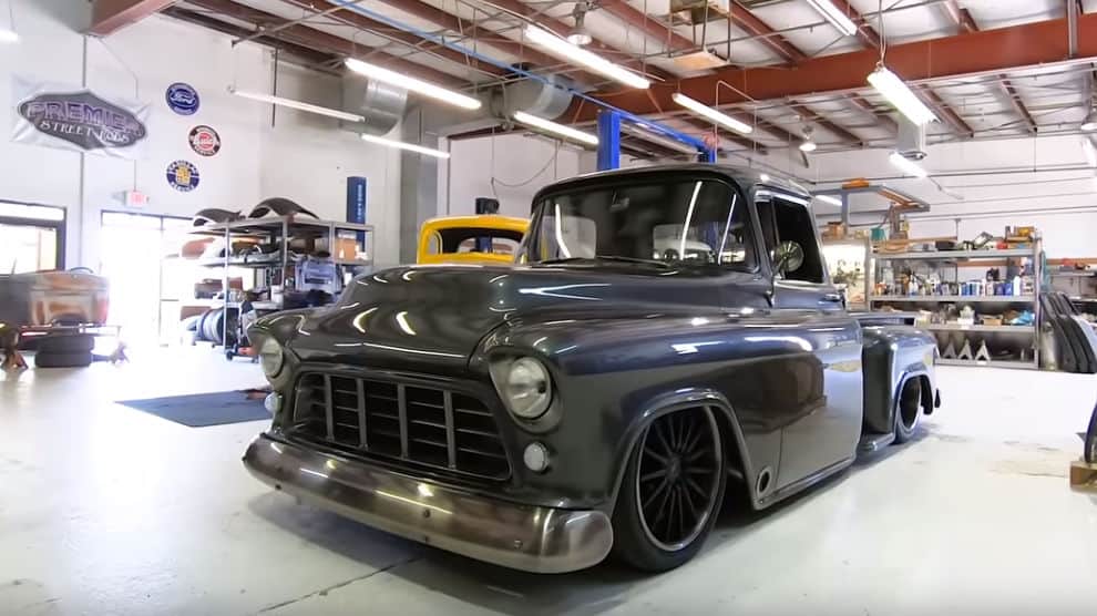 With 1000 horsepower on tap from a twin-turbo LS engine, a mean air bagged stance and perfect charcoal paint, the name “Sinister” fits this ’56 Chevy pickup perfectly. The truck is brand new from the ground up – including the GM-licensed reproduction cab by Premier.