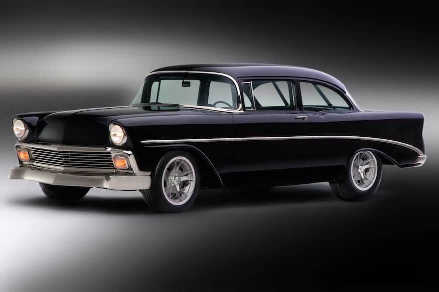 This 1956 Chevy Gasser was built for George Poteet by Roadster Shop in Mundelein, Illinois. The car rides on a custom chassis that features an independent front suspension that looks like a straight axle, and a 4-link rear suspension that looks like ladder bars.