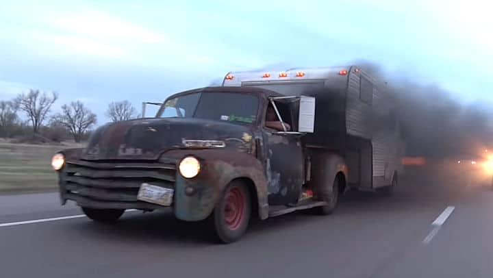 Rollin’ coal down the highway towing his camper trailer, it’s quite the sight to see! Take a tour of Troy Gubser’s Turbo Diesel Chevrolet rat rod pickup! This thing sure has character, and it’s a blast to roll around in! Watch…