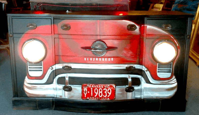 Of course, our favorites of their work are the automotive and vehicular furnishings, such as this 1953 Oldsmobile fully functional buffet equipped with working headlights, hood ornament, emblem letters from the hood, and a license plate.