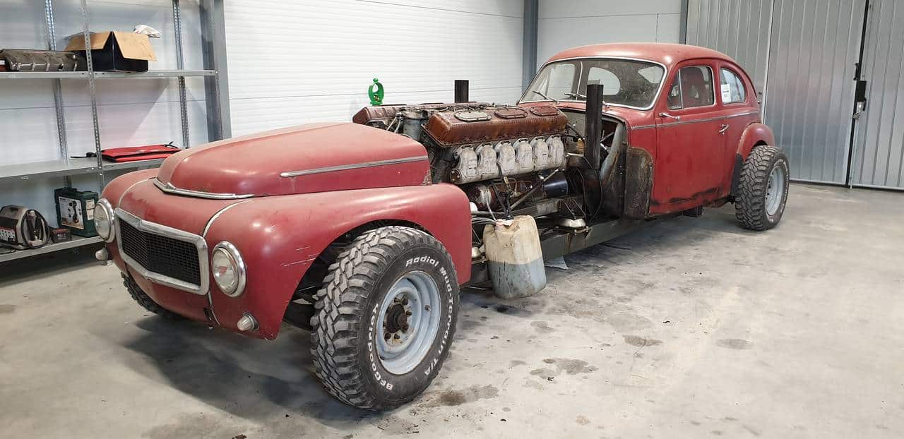 The car is a 1960 Volvo PV544 fitted with a 38.8-liter Transmash V12 diesel engine that was salvaged from a Brobandvagn 971, essentially a tank, but instead of a big gun, it carried a large folding ramp to make bridges.